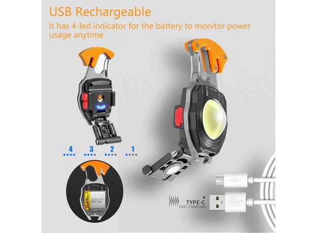 - Type-C Rechargeable and Four-grid Power Display - This rechargeable keychain work light is powered by a 500mAh built-in rechargeable battery, Type-C charging cable included for connect it to any USB power source. With power display to help monitor the power usage in real time as well as charge it when its power is insufficient.
