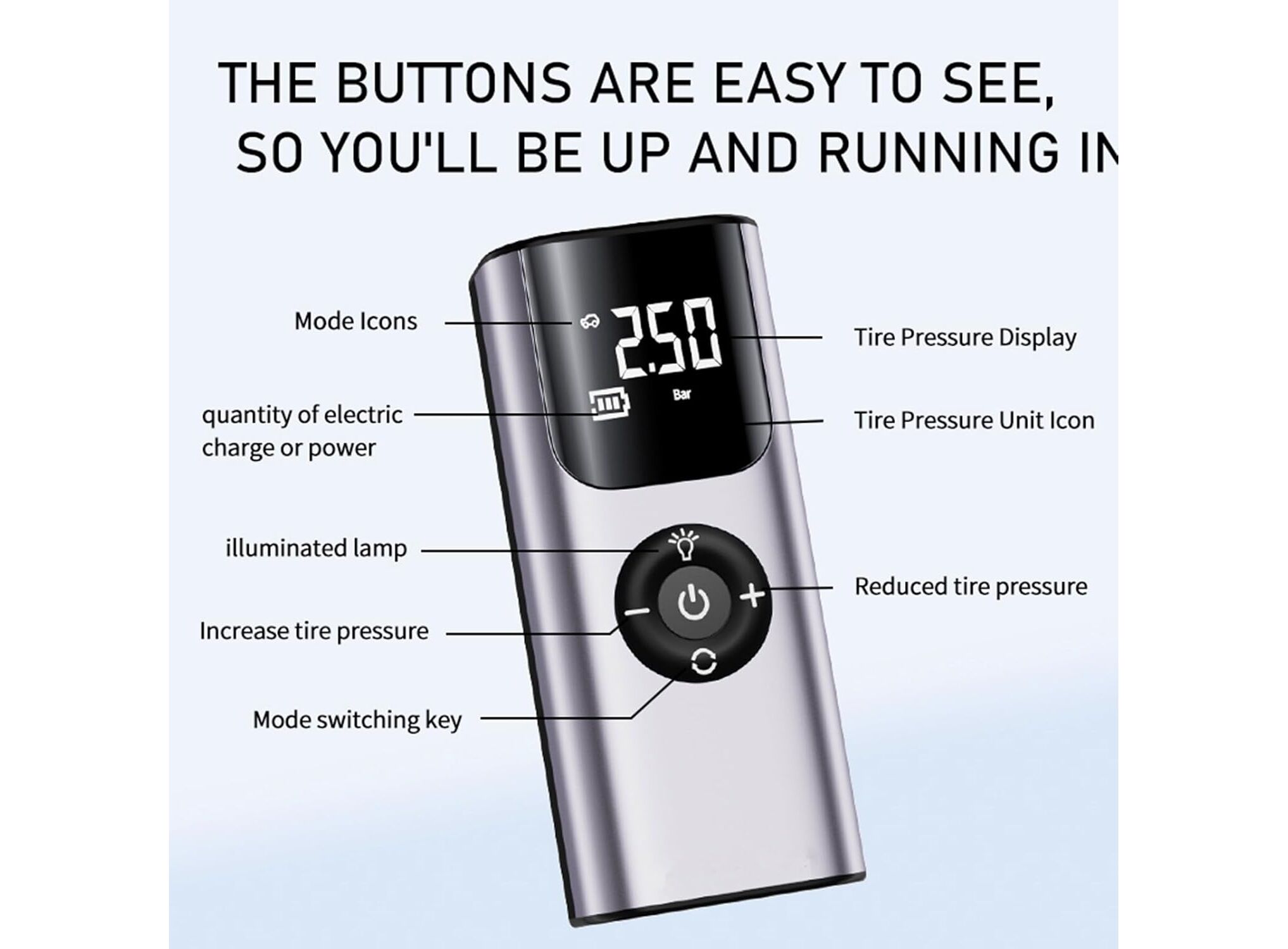 Simple one-button start with optional digital pressure display on many variants