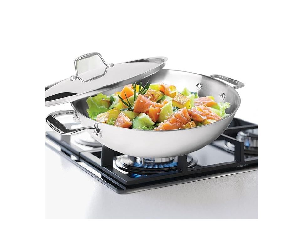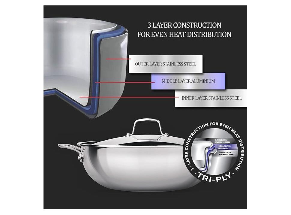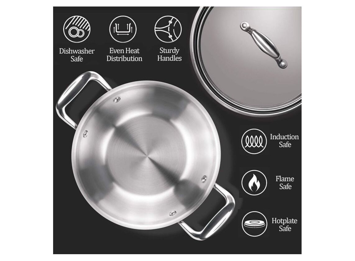 - ERGONOMIC FEATURES – To make this stainless steel kadai comfortable to use every time, it is built with multiple features. The kadai features solid stainless steel handles which have a secure rivet attachment for durability and comfort when handling the pan. It has a 3 layer flat base that makes the kadai more efficient when cooking and give stability when placed on the hob.