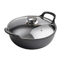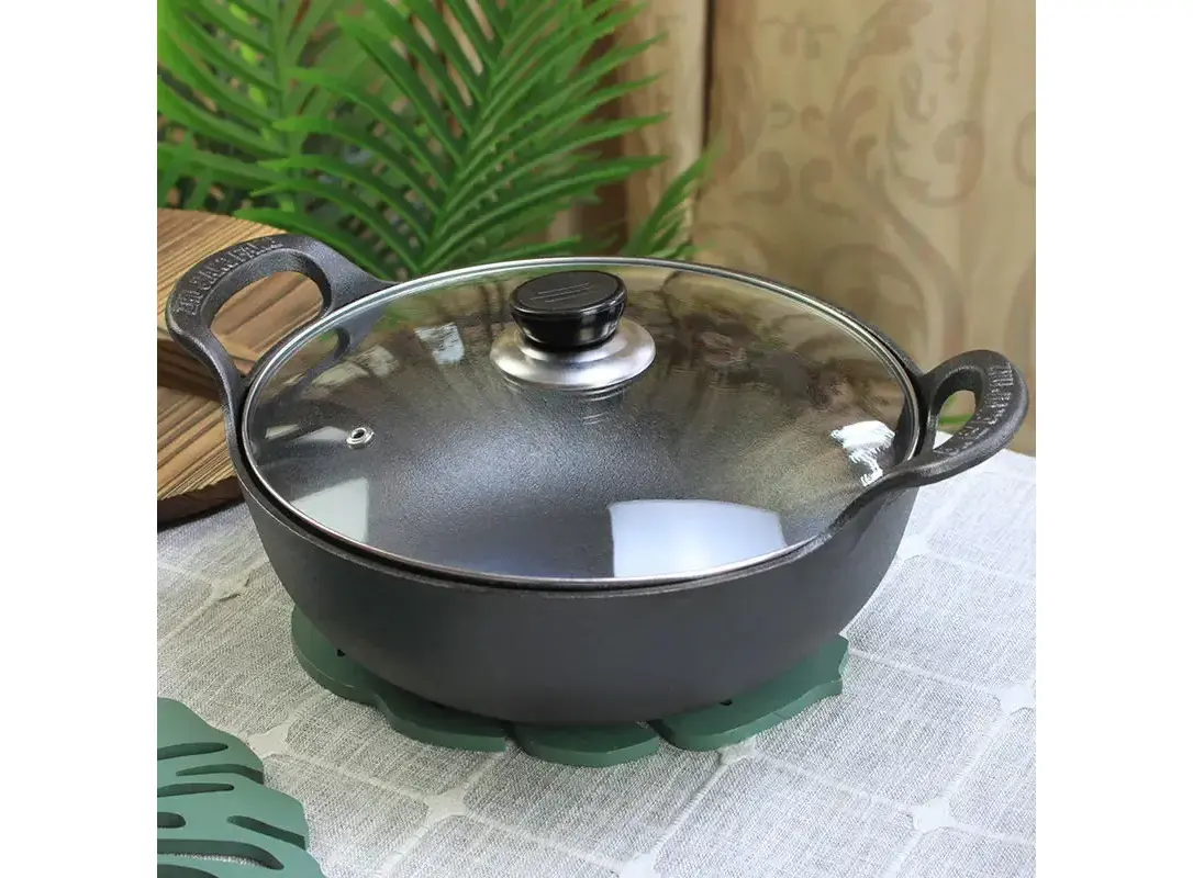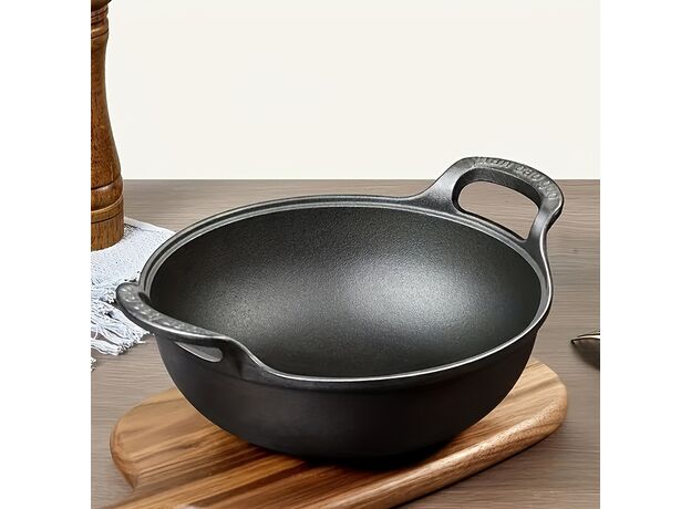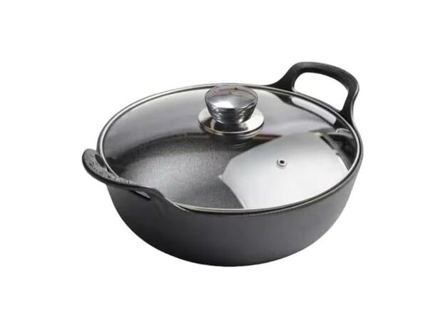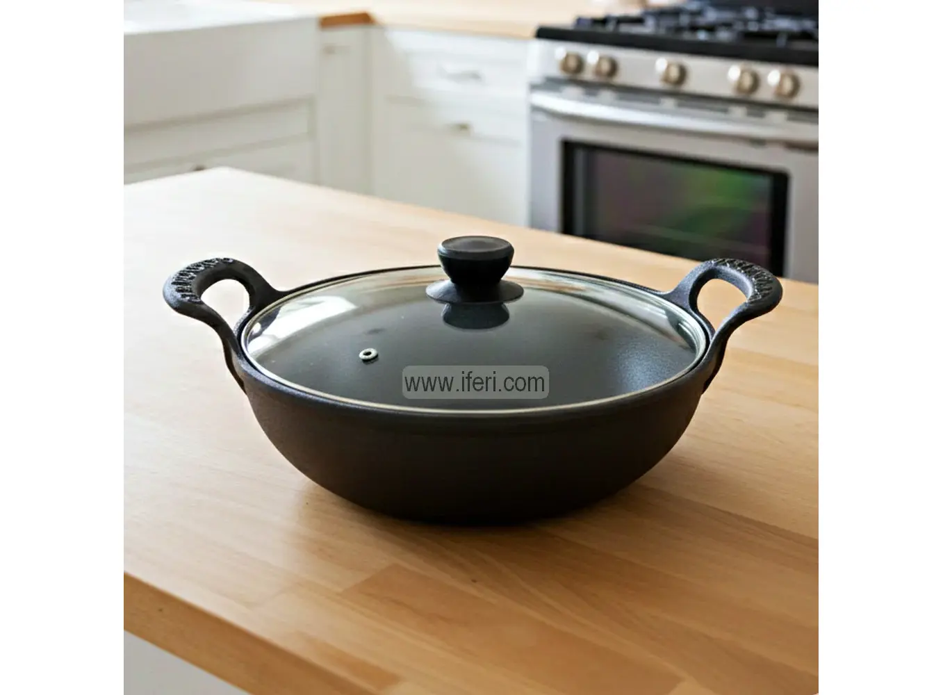This premium cast iron kadai with glass lid is perfect for deep frying, curries, sabzi, gravy dishes, and traditional cooking. Made from high-quality cast iron, it provides excellent heat retention and even heat distribution for better taste and efficient cooking. The transparent glass lid allows you to monitor food without lifting the lid, helping retain heat and moisture. Durable and long-lasting, this kadai is ideal for both everyday home cooking and professional kitchens.