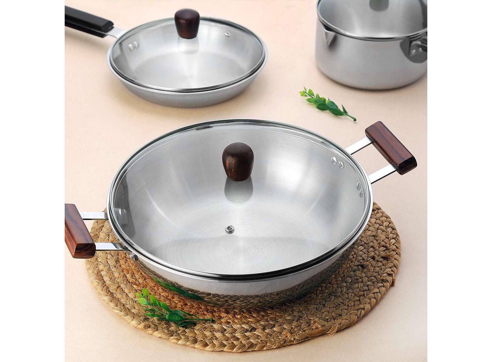 Unirize Triply Stainless Steel Kadai with Glass Lid & Wooden Handle, Fast Heating & Long-Lasting Cookware- 24CM