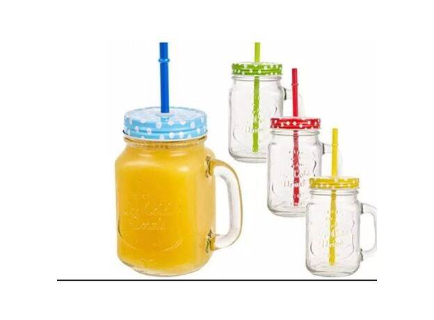 Transparent Glass Jar with Lid, Straw and Handle for Juice, Cold Drink, Milk, Shakes, Cocktail More Drinks Liquids (400 ml )